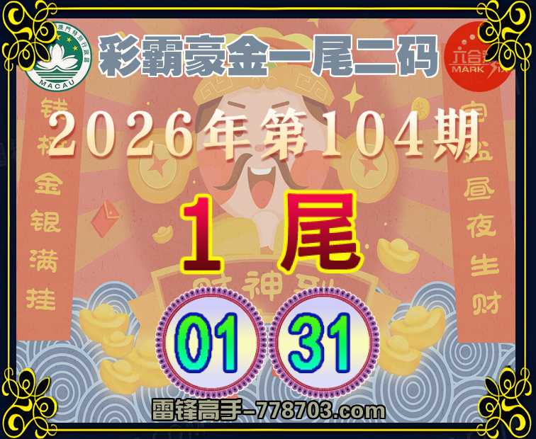 104期: 『彩霸豪金』 一尾二码1尾主:01.31】开:01